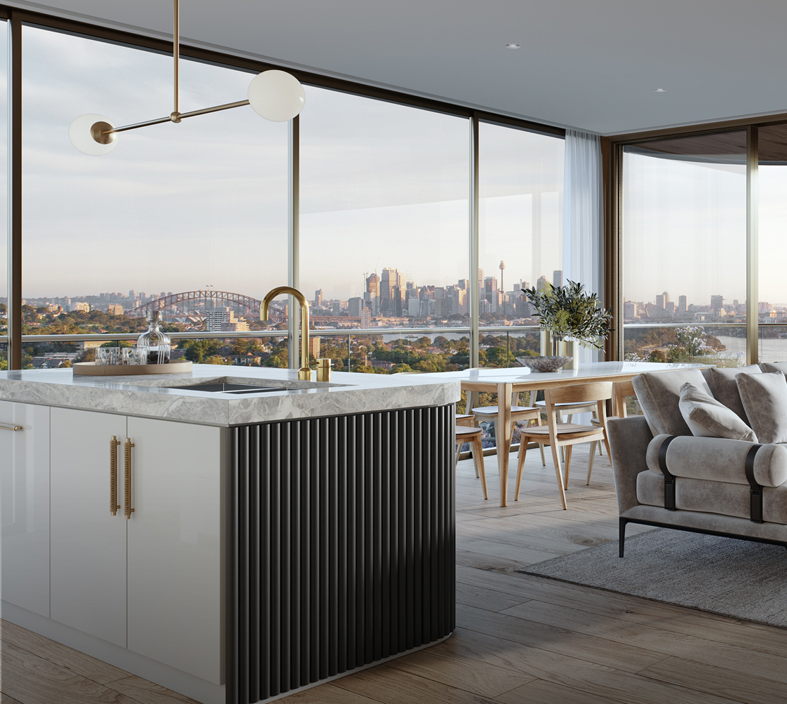 modern interiors with bespoke joinery featuring a fireplace and marble benchtops with a full suite of